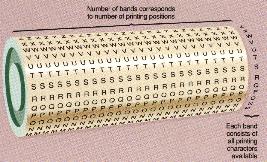 A drum printer uses a metal cylinder with rows of characters engraved across its surface (see picture below).