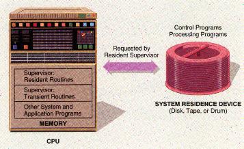 CONTROL PROGRAMS: The supervisor program (also called the monitor or executive), the major component of the operating system coordinates the activities of all other parts of the operating system. When the computer is first put into use the supervisor is the first program to be transferred into memory from the system residence device. Only the most frequently used components of the supervisor are initially loaded into memory. These components are referred to as resident routines, because they remain in memory as long as the computer is running. Certain other supervisor routines known as transient routines remain on the storage device with the remainder of the operating system. Resident routines call for these transient routines as needed and load them into memory. The supervisor schedules I/O operations and allocates communication channels to various I/O devices. It also sends messages to the computer operator indicating the status of particular jobs, error conditions, and so forth. The picture below illustrates how supervisor routines control access to the programs on the system residence device.
